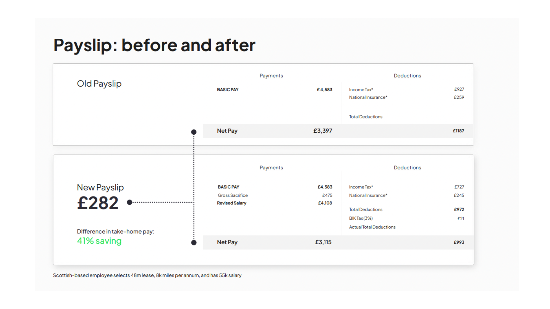 After Income Tax and National Insurance savings, their take-home pay only falls by £398, a saving of roughly £227 per month compared with leasing privately.