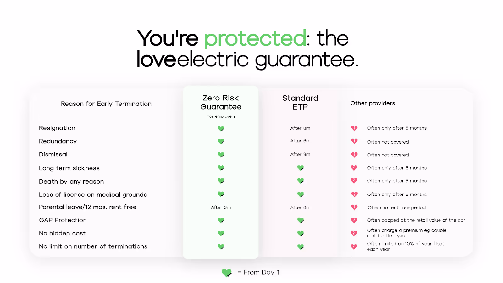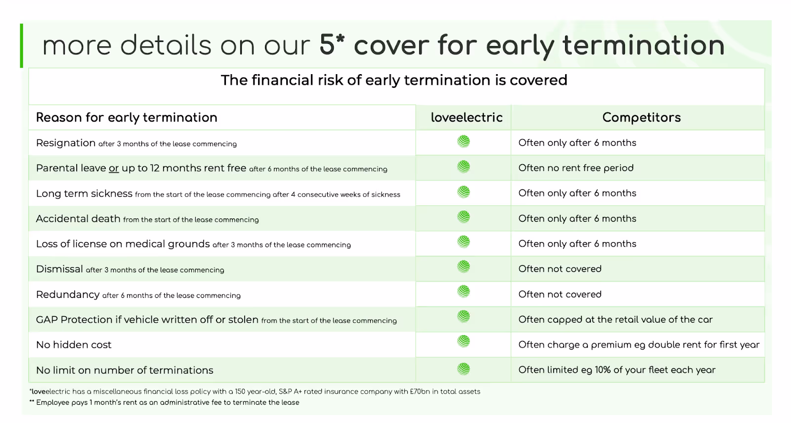 On the employer side, loveelectric includes Early Termination Protection, with an optional Zero Risk Guarantee, so the business isn’t left covering unpaid early-exit costs if recovery via payroll isn’t possible.