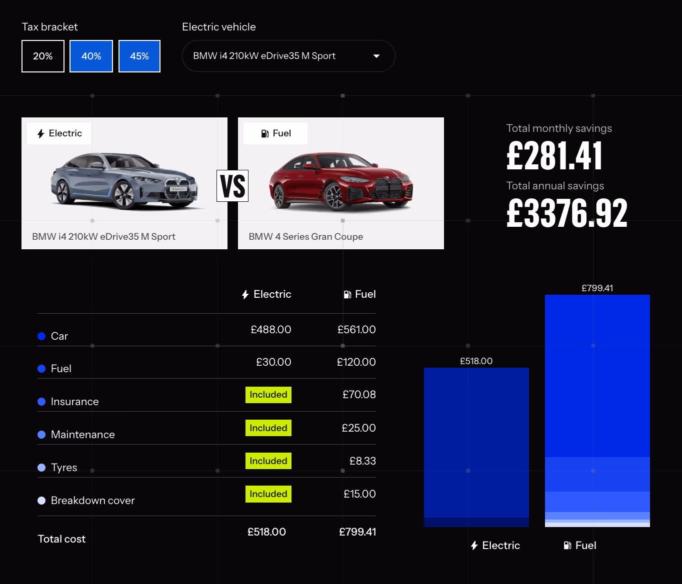 It shows your estimated monthly cost and tax savings side by side, helping you work out what switching to electric could really save you.