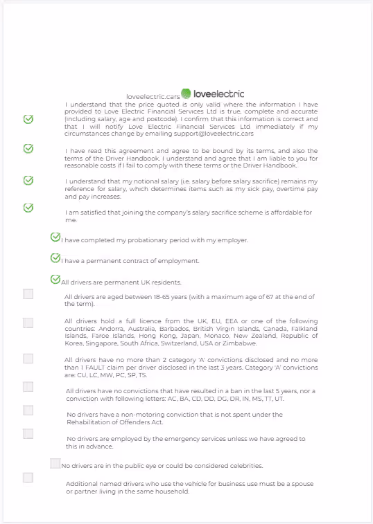 By now, you should have a better understanding of the pricing involved in a salary sacrifice scheme. As a bonus salary sacrifice electric car example, we’ll now look at what a typical driver order form looks like with loveelectric.